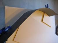 I used a large chunk of leftover rectangular laminate…approx 8“ wide by 60” long. You can see this in one of the above pictures. Using clamps I held the back of the curve in place. I would then trace with a pencil along the inner side of the curve. I would start at one end but just a bit ahead of my pencil (maybe 12“) I would place a counterweight like wood etc to push the laminate against the clamps from behind, maintaining the curve.