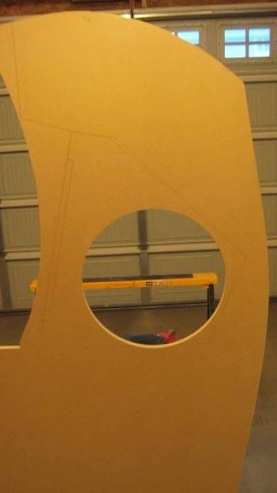 I cut a slot into the center of the hole as I will be running the T-Molding around the hole like I have seen on a few other cabs. I think it will look pretty good when done with the green neon light and artwork and T Molding as a trim: